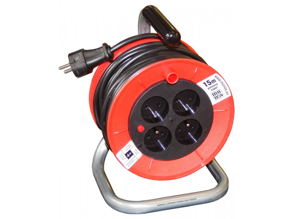 Mininaviják prodlužovacího přívodu s vestavnou zásuvkou 4 x 2P+PE a 15m kabelem H05VV-F3G1,5, buben 180mm z odolného plastu pro pohodlné navinutí celé délky kabelu, stabilní stojánek z ocelové pozinkované trubky s izolovanou rukojetí pro snadnou manipulaci, brzda cívky proti nechtěnému rozmotání kabelu, tepelná pojistka pro ochranu proti přetížení, kvalitní kabel s plastovou izolací pro střední mechanické namáhání v suchém prostředí, určeno pro vnitřní použití