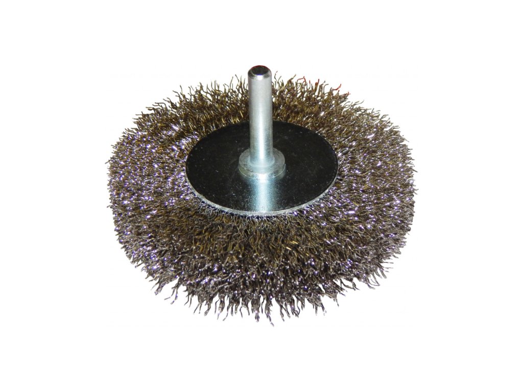 Stopkový kartáč okružní, jedna řada nerezového vlnitého drátu, průměr 80mm, upevňovací trn 6mm - například pro upevnění do vrtačky či přímé brusky.
