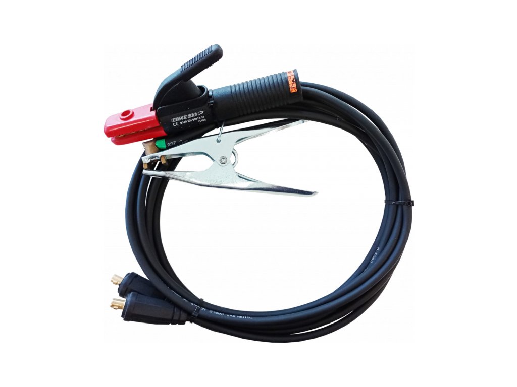 Svařovací kabely pro svařovací invertory do 130A (trvalé svařování elektrodami do průměru 2.5mm, občasné svařování elektrodou o průměru 3.2mm). Průřez kabelů 16mm2, délka kabelu s držákem elektrod 3m, délka kabelu se zemnícími kleštěmi 3m.