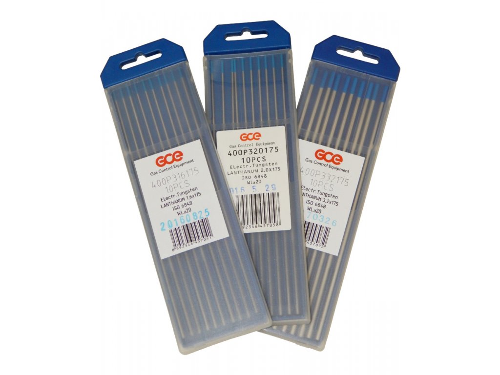 Univerzální elektrody legované oxidy Lanthanu pro svařování stejnosměrným i střídavým proudem s lepšími vlastnostmi než šedé elektrody WC20. Lanthan usnadňuje zapalování, zejména při automatizovaném svařování.