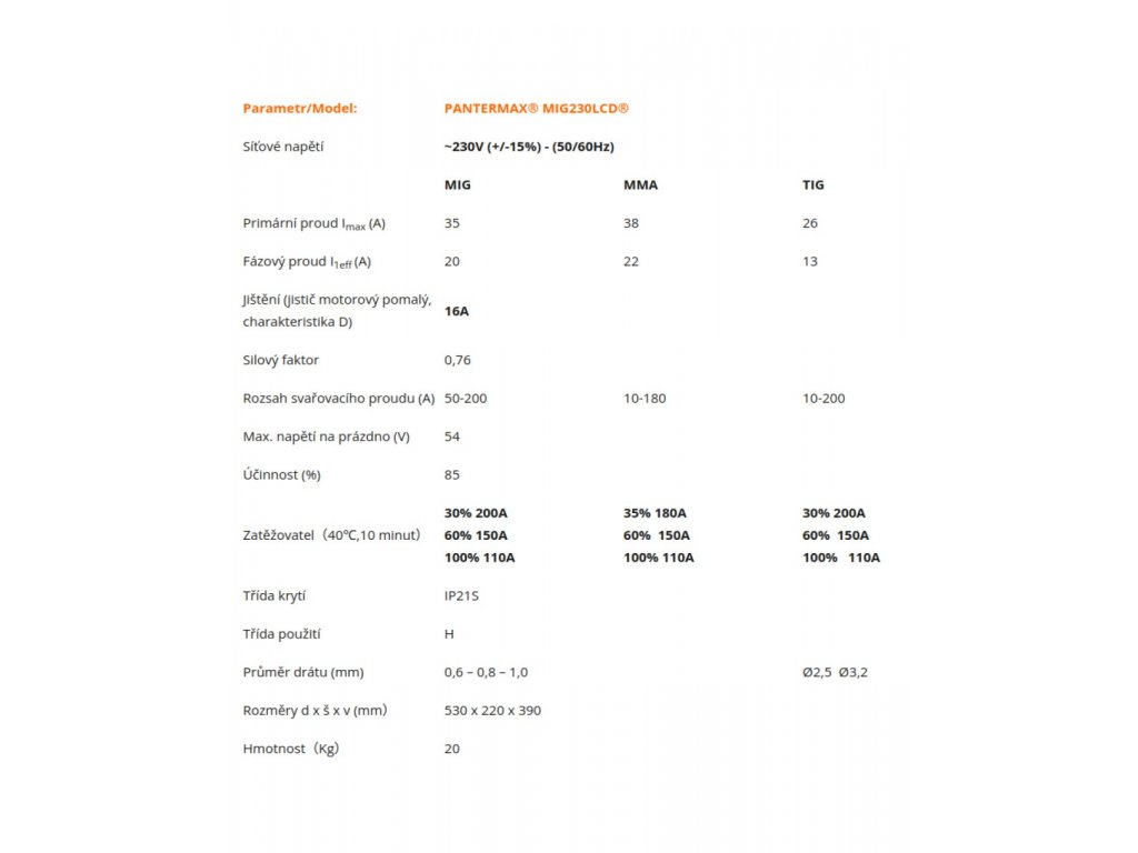 PANTERMAX® MIG230LCD je synergický mikroprocesorový svařovací zdroj pro svařování metodami MIG/MAG/MMA/LiftTIG. IGBT invertorový zdroj řízený 32bitovým procesorem a velkým barevným LCD displejem umožňuje svařování metodou MIG/MAG za použití jak standardních plných drátů v ochranné atmosféře plynu (např. G3Si1), tak i trubičkových drátů s ochranným plynem nebo bez. Grafické rozhraní a synergie použitá ve zdroji usnadňují používání a umožňují použití zdroje i lidmi s minimálními zkušenostmi. IGBT technologie umožňuje významné snížení hmotnosti a rozměrů zdroje a zvýšení účinnosti při snížení spotřeby energie.